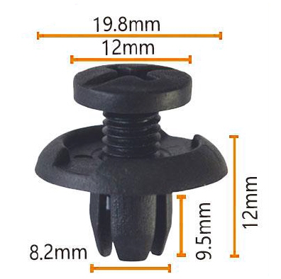 Ang pagsukat ng tiyak na 19.8mm ang haba, 12mm ang lapad, 9.5mm ang taas, at 8.2mm ang kapal, ang fastener na ito ay umaayon sa mga pamantayan sa industriya, tinitiyak ang isang walang tahi na akma sa iba't ibang mga bahagi ng automotiko. Ginawa mula sa high-grade na itim na plastik, ipinagmamalaki nito ang magaan na konstruksyon, paglaban sa kaagnasan, at paglaban sa pagsusuot, pagpapahusay ng kahabaan nito.